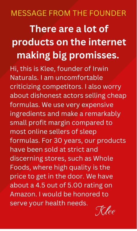 For specific information on any Irwin Naturals® product, please see the product label and product display page. Please note our trademarked brand name Irwin Naturals® is not a representation about the composition of any Irwin Naturals® product.